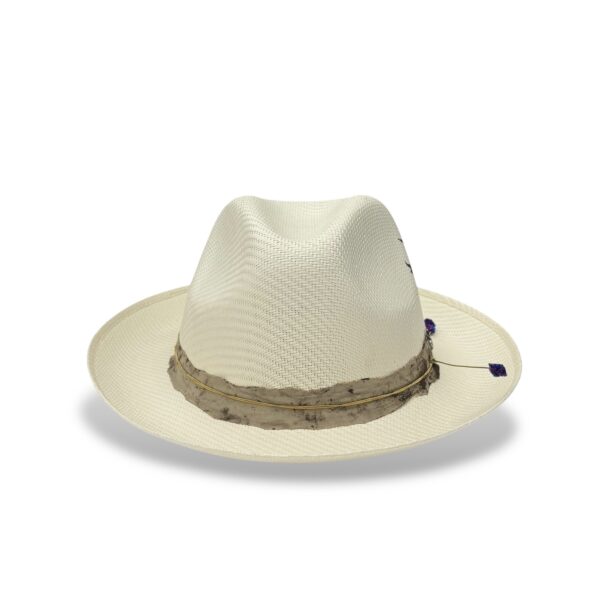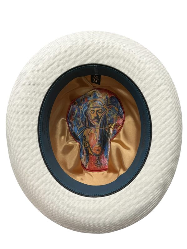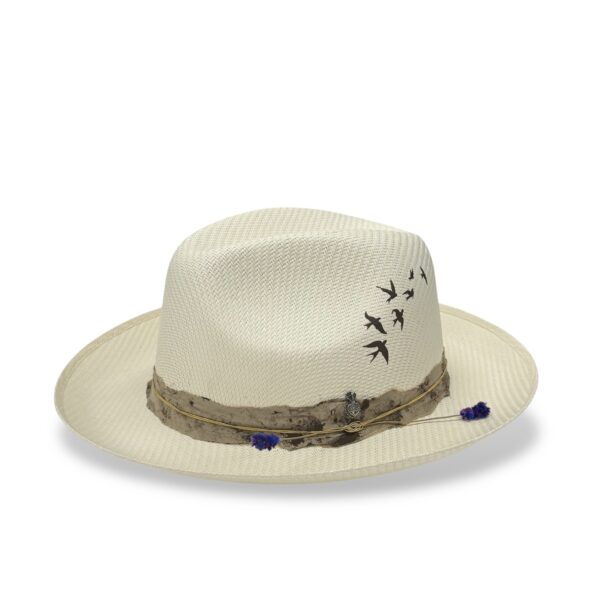 Sacred by design and soulful in spirit, the Milagro Sagrado is a refined evolution of the original Milagro Straw. Crafted from fine woven straw, it features a soft downturn pinch crown wrapped in a rustic-textured band. Layered accents like a symbolic guitar string and the signature Milagro heart pin give this piece its unmistakable character. A flock of birds printed on the crown symbolizes freedom and movement, while inside, a teal leather sweatband and bold “Shaman” printed satin lining complete the story.